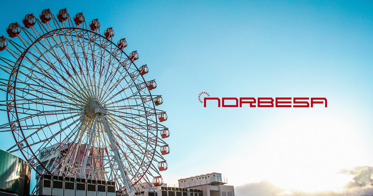 道路をわたって正面が観覧車のある商業施設ノルベサ。